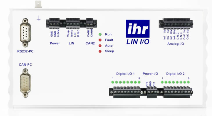 LIN I/O是一個(gè)生產(chǎn)線產(chǎn)品自動(dòng)化測試工具。提供產(chǎn)品與產(chǎn)線設(shè)備間的LIN通訊,并將通訊信號轉(zhuǎn)換為數(shù)字/模擬I/O輸出輸入或CAN總線輸出輸入。通過LIN I/O可以為測試對象提供有保護(hù)的總線通訊。能夠進(jìn)行LIN數(shù)據(jù)及信號的預(yù)處理。如,檢查限定值或可靠性,控制設(shè)備終端校準(zhǔn)等。