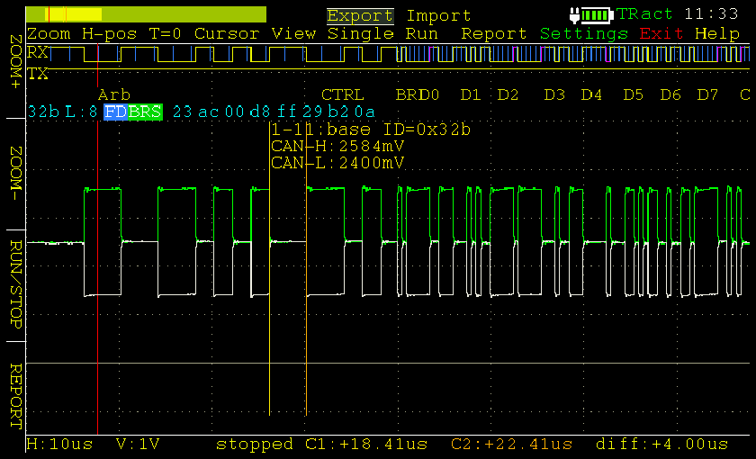 示波器功能用于CAN總線上的信號曲線進行質量評估。CANH和CANL使用獨立的測量通道采樣,采樣頻率達100MHz。基于采集的信號曲線,PCAN-Diag FD可以解碼CAN報文,并圖形化顯示將報文的要素。