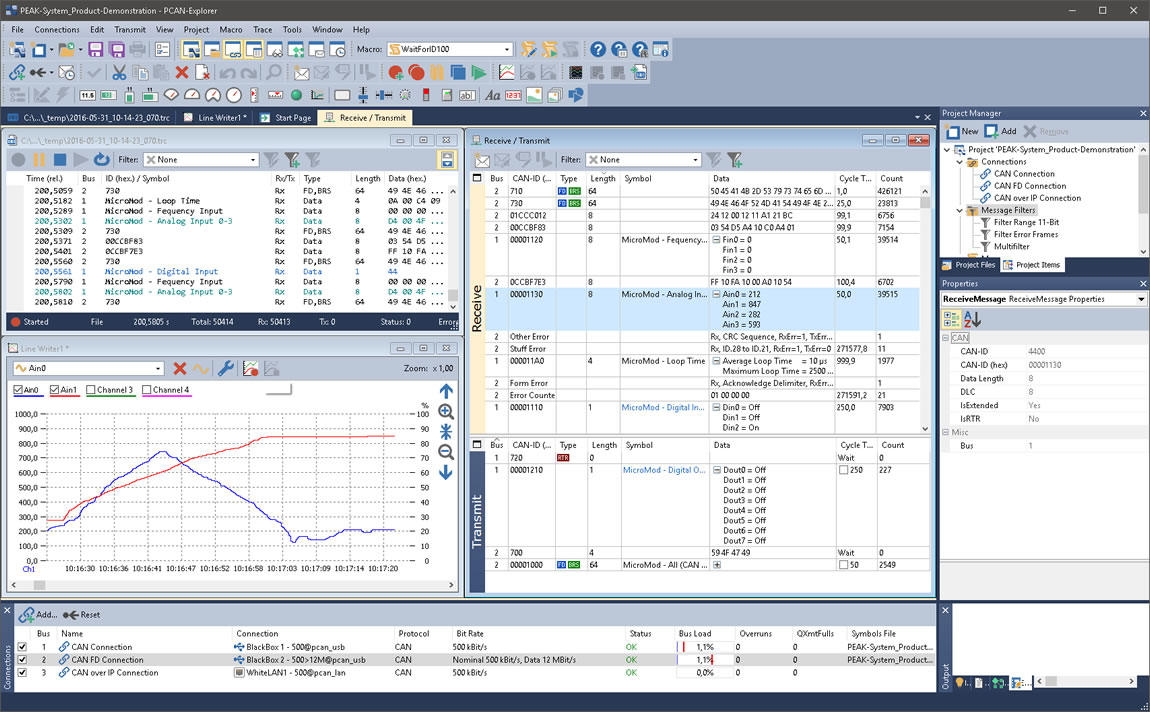 PCAN-Explorer 6是一款應用于CAN/CAN FD網(wǎng)絡的多功能專業(yè)軟件。用戶不僅能夠觀察CAN流量。還允許手動或周期傳輸報文或整個傳輸列表,例如,進行控制或仿真。