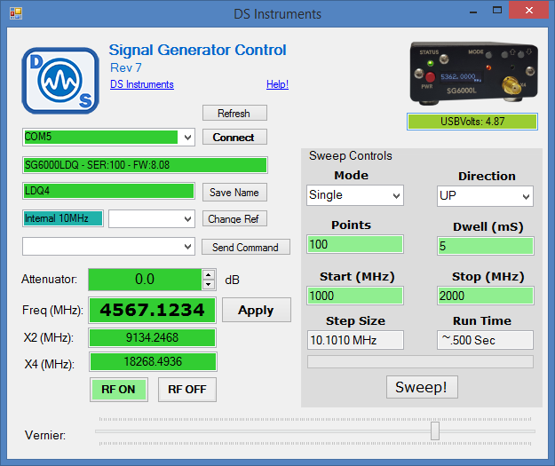| 我們的SG6000LD緊湊型RF信號發生器能夠使用戶以低成本生成高質量的RF信號。該輸出范圍覆蓋了大功率內置倍增器的24至6000MHz和6000至12000MHz的7個octaves。使用現代分數N型合成器完全合成產生的波。根據工作頻帶,非雙倍RF輸出步進長度從最大的~3KHz變化到小于40Hz。合成源可以接受外部10MHz的參考源或者可以使用其內部的10MHz源。輸出功率通常高于6dBm,可通過USB命令打開/關閉。清晰的OLED顯示可以為用戶提供有用的反饋信息,前置控制按鈕快速替代了USB控制方案。像我們大多數產品一樣,SG6000LD適合手掌大小,使其成為真正的便攜式和節省空間的設備。 |