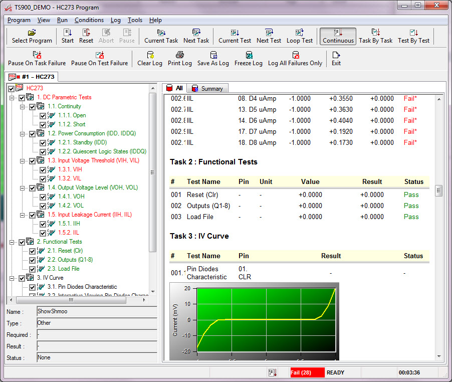 The IV Curve Tracer tool can sweep on Voltage or Current and plot the results. You can also append the plot to the test log or export the result to a CSV/Excel file. Multiple pins (a group) can be also plotted on the same chart. The tool can be also called in an automated mode, displaying the results directly to the test log. |