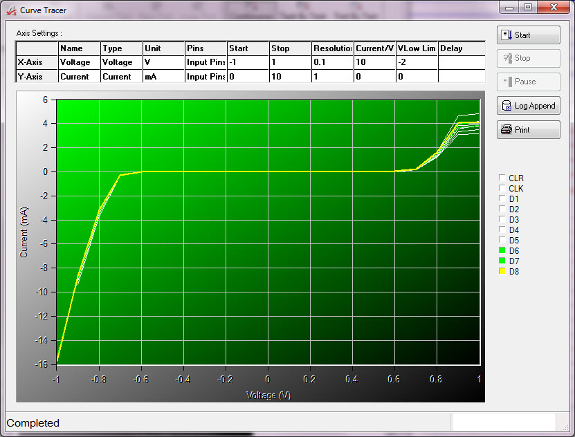 ICEasy的I-V曲線工具允許用戶輕松設(shè)置電壓和電流范圍和步進(jìn)增量,以及按名稱定義要測試的特定引腳(或引腳)。此外,所有I/O引腳可以繪制在同一個(gè)圖形上,提供了一種比較所有器件I-V曲線的簡單方法。(見下圖)繪制的數(shù)據(jù)也可以通過TS-900的測試執(zhí)行程序(ATEasy)輕松導(dǎo)出。易于測量I-V特性和繪制結(jié)果的能力是故障分析和設(shè)計(jì)驗(yàn)證應(yīng)用的關(guān)鍵特性。 |