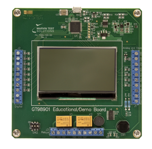 所有功能的控制都是由板載PCI微型控制器提供。板卡上由4個(gè)12位的A/D通道,2個(gè)D/A通道。此外,還有8個(gè)數(shù)字I/O通道,2個(gè)C型繼電器,2個(gè)LED燈,蜂鳴器,2個(gè)DIP開(kāi)關(guān)和一個(gè)自恢復(fù)按鍵。所有功能均可通過(guò)板上提供的SCPI功能庫(kù)訪問(wèn)。 另外,LCD顯示器安裝在板上,提供板狀態(tài)。 通過(guò)USB端口提供板的控制和供電。