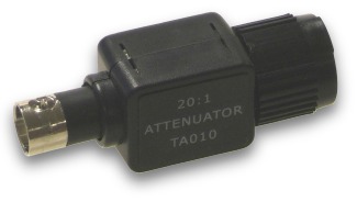 The PP198 is a passive 20:1 attenuator. This means that a 20 V signal at its input will appear as a 1 V signal on the output. As the signal is attenuated, the PP198 allows voltages of up to 300 V to be measured (see the safety precautions).