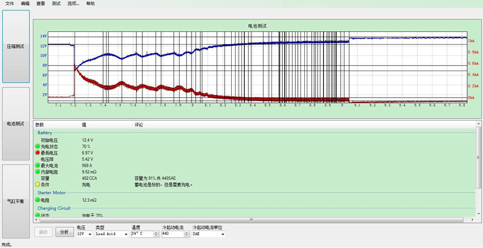 蓄電池測(cè)試測(cè)量打馬達(dá)和發(fā)動(dòng)機(jī)起動(dòng)過(guò)程中蓄電池的電壓和電流。從這些信號(hào)計(jì)算出一些關(guān)鍵的參數(shù),用于探測(cè)故障。