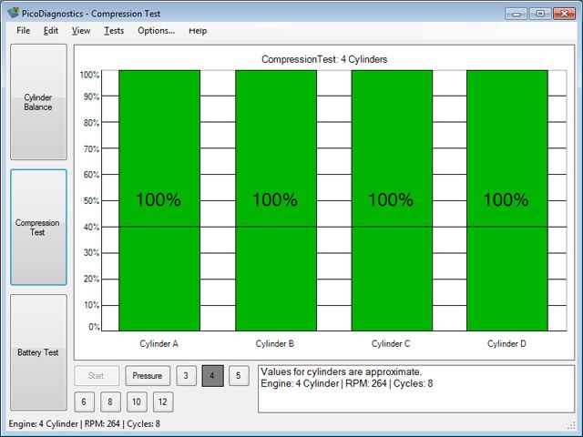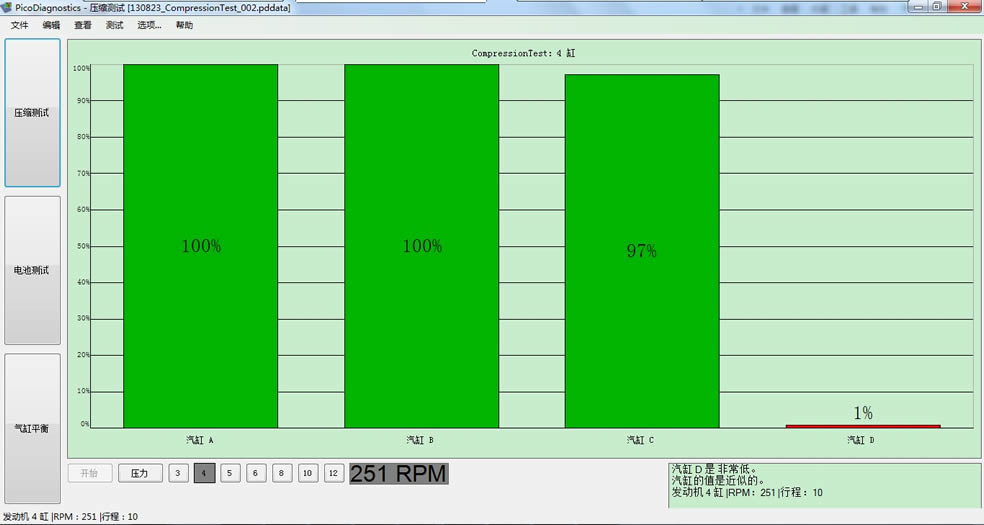 一旦測試完成后,該軟件將分析數據,最后用條形圖顯示結果。圖4顯示汽車的所有汽缸的壓縮都良好。