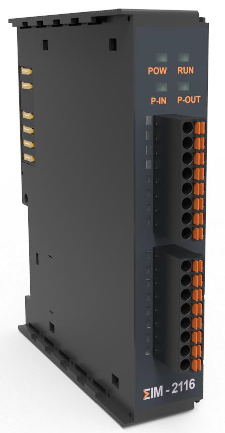 EIM 2116 模塊用于將更高等級的自動化設備(如:控制器)輸出的二進制控制信號,經過電氣隔離后,傳送給執行器進行動作。EIM 2116 模塊包含了16 個輸出通道,每個通道都有極性反接、過載、欠壓、過流、短路保護。同時可以將所有的輸出信號狀態通過端口旁的LED 指示燈進行顯示。緊湊型設計為電器柜節省了更多的占用空間。