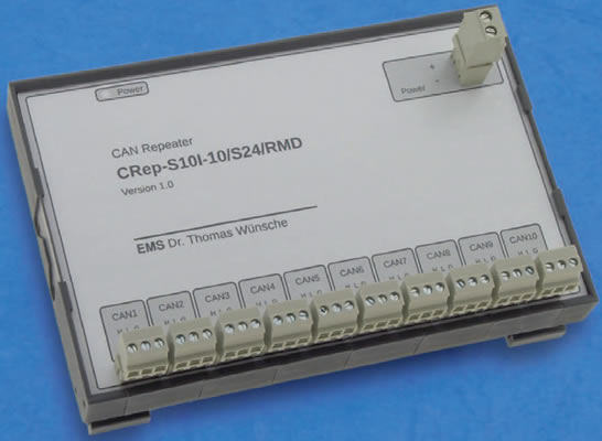 這款緊湊的CAN中繼器CRep S10I以協議透明的途徑傳輸和放大CAN信號。10路CAN連接的每個都