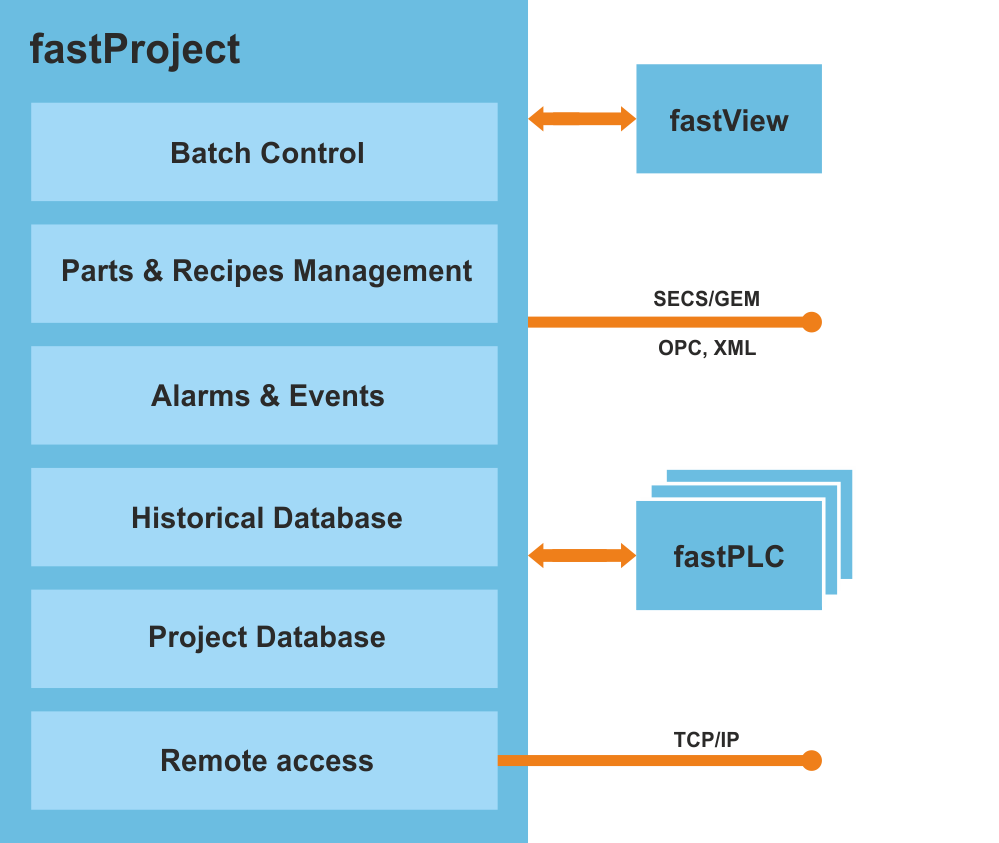 fastProject 負責數據在控制層 (fastPLC) 和可視化 (fastView) 之間交換,通過設備配置、批量控制、收集過程 有關的數據和報告生成。 fastProject 使 SCADA 通訊能夠實現,帶信息系統 (MES, ERP, QMS),適用于深度垂直集成到公司的信息網絡。