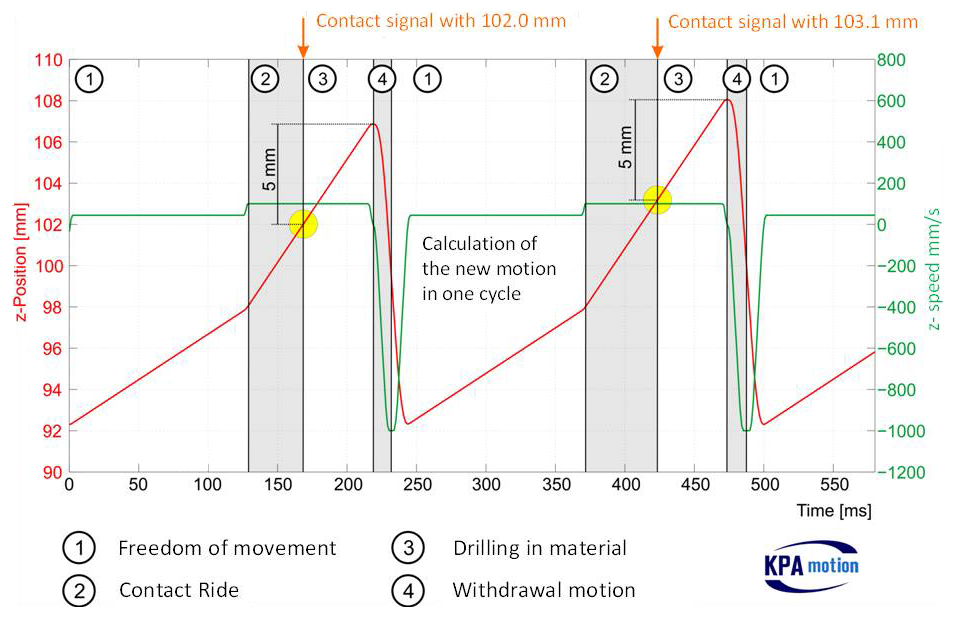 Phase 1 starts with a slow motion to allow for positioning the x-y table. Phase 2 contains a fast approach motion, during which the contact with the material is expected. At the moment of contact, the exact position is captured using a touch probe sensor ( 102.0 mm, left yellow circle), and in the same control cycle, a drilling motion relative to this position is computed online and executed immediately (Phase 3). After reaching the depth of 5 mm, the drill is pulled out of the material (Stage 4). In the second cycle, the contact is detected at 103.1 mm (right, yellow circle). |