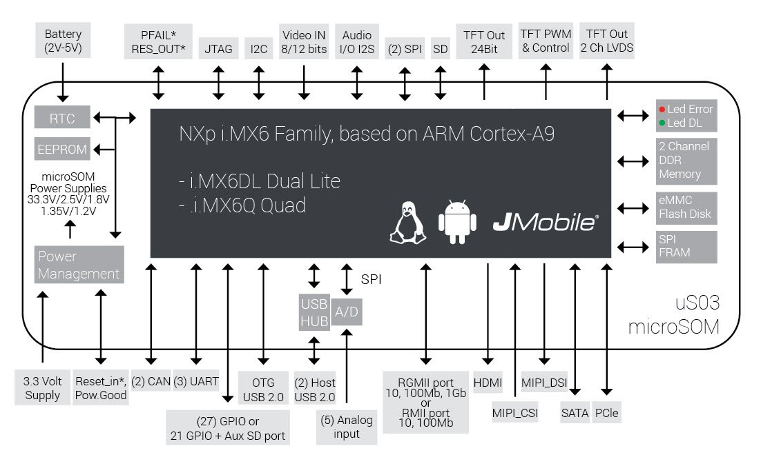 uS03是microSOM系列的高度創(chuàng)新的高性能i.MX 6 Quad / Dual / DualLite / Solo內(nèi)核ARM Cortex-A9。