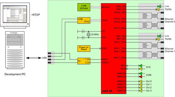 網絡控制器netX 50以32位ARM為CPU核,主頻200MHz,能提供高處理性能和所有主流現場總線和實時以太網系統的控制功能。netX 50具有內部雙端口內存DPM,能夠直接連接到主機系統中作為通訊接口,而無需額外的元器件。再結合相應的協議堆棧和實時操作系統內核,整個系統的功能就能很容易實現,且無開發風險。