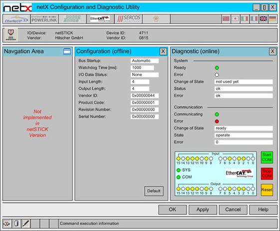 “netX Configuration and Diagnostic Utility”程序以源碼的形式來提供,允許將netSTICK作為一個簡單的IO設備,不僅支持某種網絡通訊協議,還帶有16路輸入輸出。