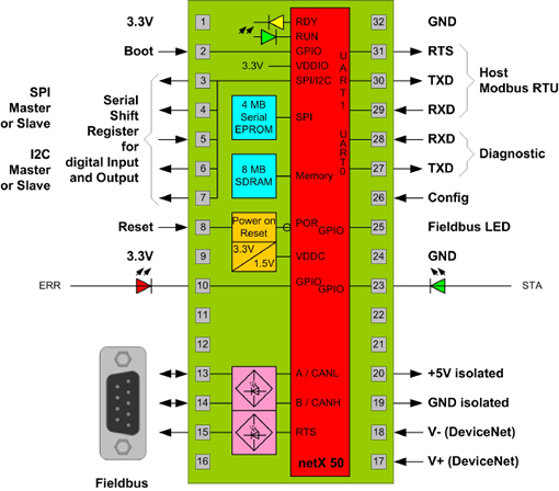 netIC是一種完整的“單片模塊”,尺寸緊湊,采用32針DIL封裝。它基于netX 50網絡控制技術,包括了集成2端口Switch和Hub的實時以太網接口的全部元件。這些串行接口可以應用于使用簡單讀寫命令的用戶數據的傳輸。另外,通過同步串行接口可以控制一般的移位寄存器,因此不再需要額外的處理器。