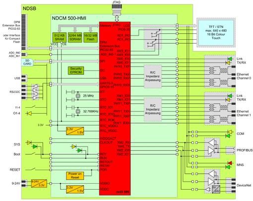 netDIMM模塊集成了內存、振蕩器、復位發生器和DC/DC轉換器,只有以太網或現場總線的物理接口需要外部提供。