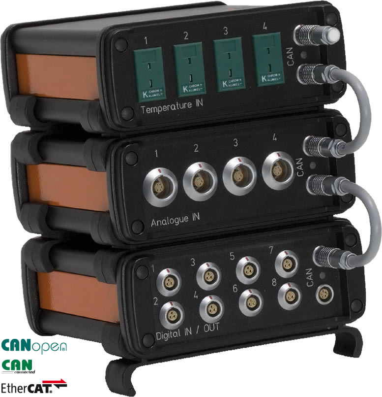 4通道溫度采集模塊。傳感器通過雷莫插入式接頭K系列連接,電源/CAN通過雷莫插入式B系列接頭連接,包括2個連接組件用于串接多個F1模塊。 |